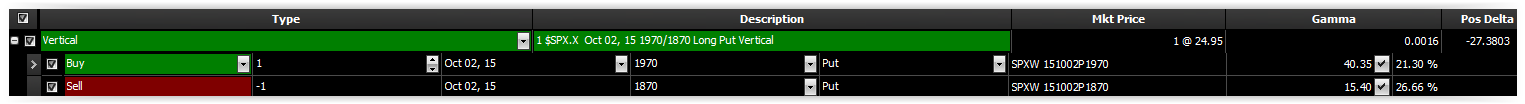 Si vous reprenez l’exemple ci-dessus, l’achat du Put de Strike 1970 coutait $40,35. En vendant le Put de Strike 1870, j’ai réduit de $15,40 le coût du trade.