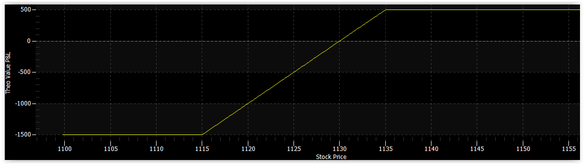Strike acheté 1135 – 1130 (cours du sous-jacent) = 5. Comme le crédit reçu pour mettre en place le trade était de $5, le gain (ou la perte) est de $5 – $5 = $0.00 dans ce cas il s’agit du point mort (comme par hasard 😉 ). Si le Russell 2000 fini au-dessus de 1130, alors le trade sera gagnant et si le Russell 2000 termine en dessous de 1130, alors le trade sera perdant.
