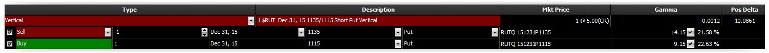 J’insiste sur le fait que quel que soit le niveau du Russell 2000 à l’échéance, la perte ne pourra excéder $15, même si le Russell 2000 dévisse de 30%. La perte maxi sur le Bull Put Spread correspond également à la marge requise par votre broker pour mettre en place le trade.