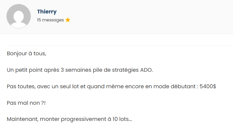 Prenez Thierry, par exemple. Après seulement trois semaines de pratique avec nos stratégies ADO (Atelier Des Options), il a réussi à générer 5 400 $ de gains, remboursant ainsi largement le prix de sa formation. Et le plus impressionnant ? Il tradait encore en mode débutant, avec un seul lot. Comme il le dit lui-même : « Pas mal non ?! Maintenant, monter progressivement à 10 lots… »